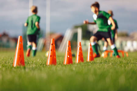 Football Slalom Drill Training Equipment. Row of Red Training Cones. Boys Running Balls in the Background. Soccer Grass Training Grass Pitch