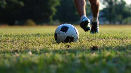 player playing soccer with ball, close up of foot and ball on green grass, by ai generative