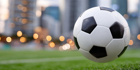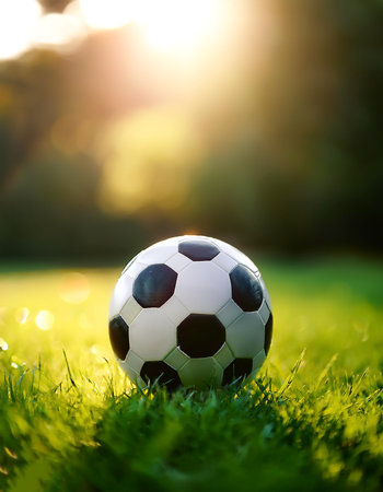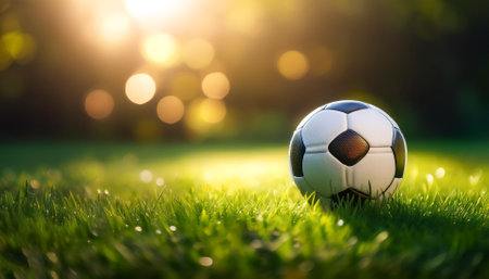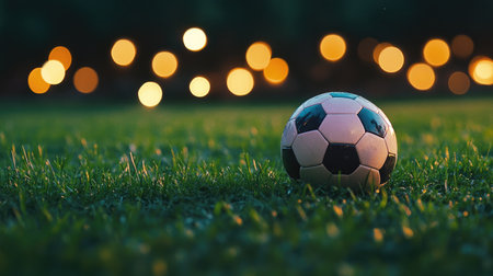 A soccer ball sitting on green grass with soft bokeh lighting in the background, perfect for capturing the spirit of football.