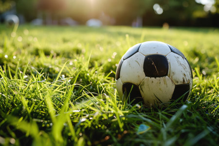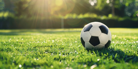 A soccer ball on a lush green grass field, ready for play during a sunny day, capturing the essence of sports. High quality photo
