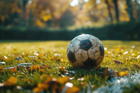 worn soccer ball rests on grass, with a blurred goalpost in the background, surrounded by autumn leaves