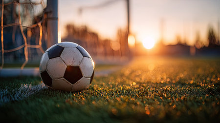 A soccer ball sits on the edge of a grassy field near a goalpost, bathed in the warm glow of a setting sun. The image showcases a shallow depth of field, with soft focus on the background. This composition suggests a serene atmosphere, potentially suitable for sports, recreation, or editorial content.