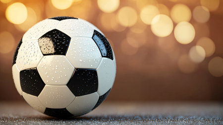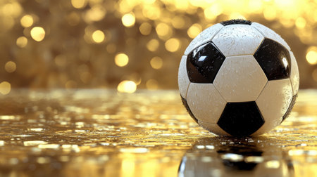 A close-up of a wet soccer ball rests on a gleaming surface, surrounded by a bokeh background of golden hues, capturing the essence of sport and celebration.