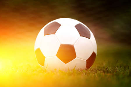 Old Soccer ball, Football on the grass line in soccer stadium at night with copy space and player with light background. goal,success concept.