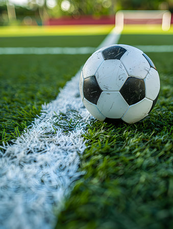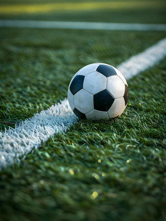 Soccer ball rests on the green grass of the field with the white boundary line in the foreground, embodying the spirit of the game