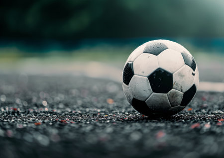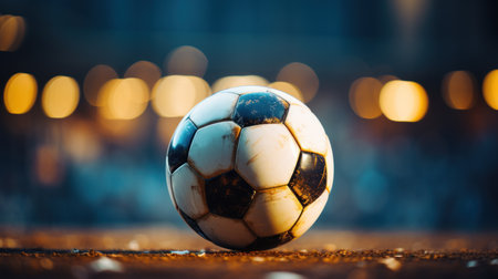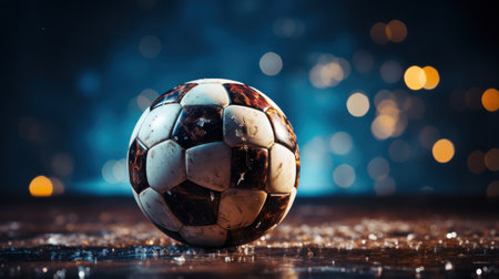 A close-up shot of a wet soccer ball with water droplets The ball is positioned against a blurred background of bokeh lights creating a visually appealing image perfect for sports-related themes or background designs