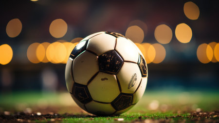 An AI generated illustration of a soccer ball in the field illuminated by stadium lights