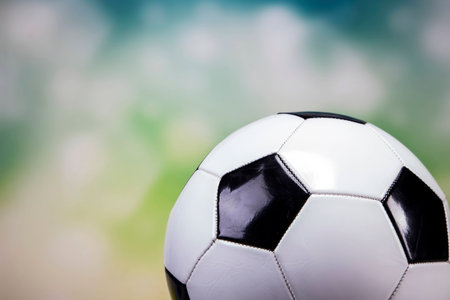 Soccer ball on a green background in bright light. The concept of the popular ball game.