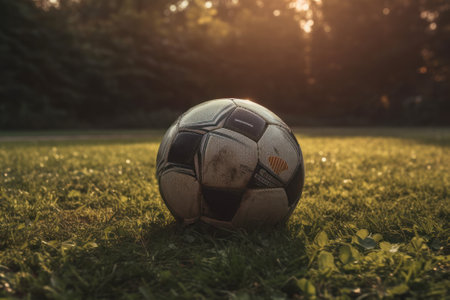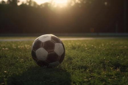 A lone soccer ball rests on lush green grass, illuminated by warm sunlight during sunset. The blurred background enhances the serene atmosphere ideal for sports.