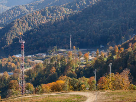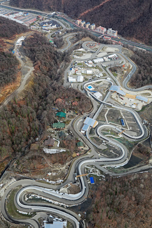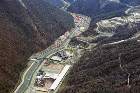 SOCHI, RUSSIA - MAR 02, 2014: Krasnaya Polyana - alpine ski Resort, venue for the 2014 winter sports competitions. The sliding center Sanki, top view