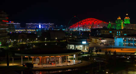 Sochi, Russia - May 9, 2024: Evening landscape scene Adler district, Sochi city. Beautiful view with palm trees and night lights on the building.