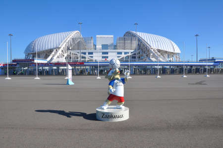 SOCHI, RUSSIA - JUNE 5, 2017: The mascot of the World Cup 2018 Zabivaka in front of the stadium Fisht.
