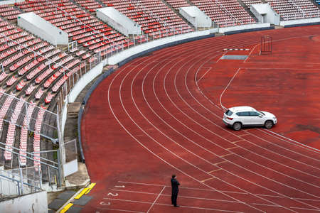 Moscow region, Russia - 27 August : route Moscow raceway technical staff male in an orange jumpsuit , the clothes are on the inner track in day of Russian cinema 27 August, 2016.