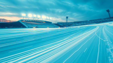 This captivating night image captures a race track illuminated by bright lights, showcasing dynamic light trails from speeding cars and the vibrant atmosphere of motorsports.