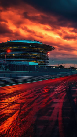 This captivating nighttime image of a race track captures the vibrant reflections on wet pavement under dramatic lights, creating an electrifying atmosphere.