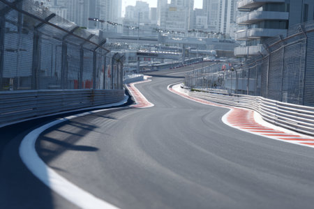 Racetrack curves sharply through a cityscape with tall buildings. Smooth asphalt surface allows for high-speed racing. Sunlight illuminates the scene creating dynamic shadows.