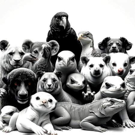Vibrant scene with realistic animals like cats, dogs, and exotic pets displayed against a clean white background, suitable for text overlays.