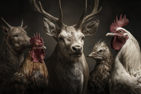 Wildlife gathering with deer and domestic fowl in a harmonious setting showcasing nature's diversity during a quiet late afternoon