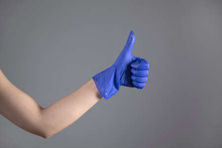 woman hand blue glove and okay sign on grey background