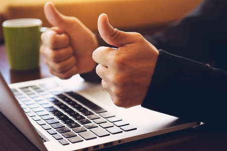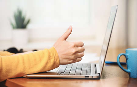 Side view of slim laptop and like thumb up hand. Distant learning. working from home, home office or online courses e-learning. vlogger blogger streaming. Happy client