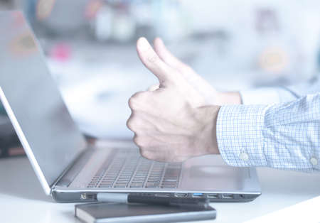successful handsome businessman sitting in front of laptop, showing thumbs up in modern office. Successful deal negotiations, good work results, satisfaction with investment concept.