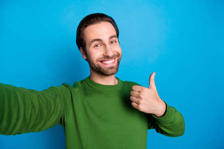 Photo of young good mood handsome male take selfie showing thumb-up feedback like isolated on blue color background
