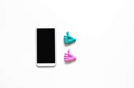 Smartphone with signal of hand or social media sign emoticon.communication and symbol.blank space