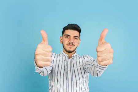 Young mans portrait on blue studio background. Concept of human emotions, facial expression, youth, sales, ad.