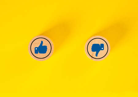 Wooden blocks with thumbs up and thumbs down. Positive and negative concept.