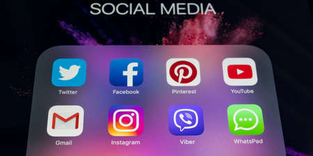 Kiev, Ukraine - November 27, 2019: Background of famous social media icons such as: Facebook, Twitter, Blogger, Linkedin, Tumblr, Facebook Reactions and others, printed on paper
