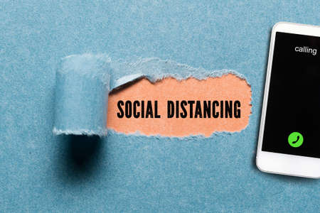 torn paper revealing message SOCIAL DISTANCING beside a smartphone on paper background