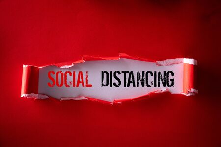 Top view of Black torn paper and the text SOCIAL DISTANCING on a red background. Healthcare and medical concept.