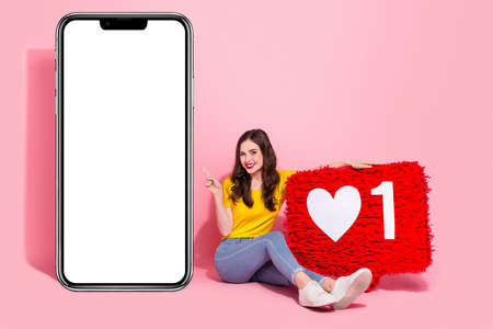 Full length portrait of attractive girl sit floor direct finger empty space blank display isolated on pink color background