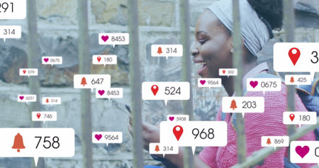 Image of social media notification over african american woman with bike using smartphone. global communication technology and social network concept digitally generated image.