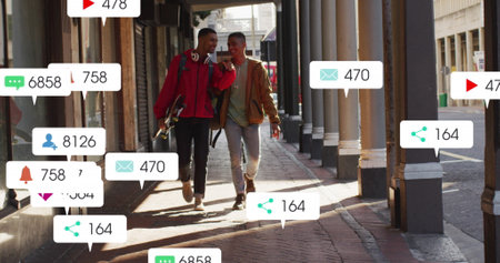 Image of multiple notification bars over diverse friends discussing while walking on street. Digital composite, multiple exposure, business, togetherness, social media reminder and technology.