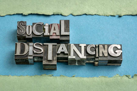 social distancing word abstract in gritty vintage letterpress metal types, mixed fonts, a set of infection control actions to stop or slow down the spread of a contagious disease.