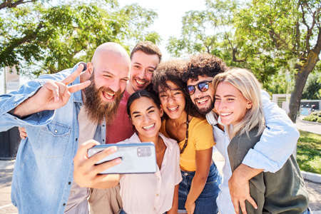 Group of young multiracial friends taking a selfie with a mobile phone outdoors.