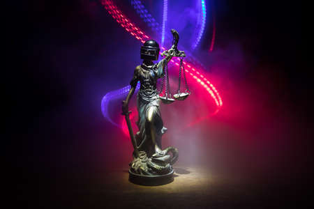 Law concept. Miniature colorful artwork decoration with fog and backlight. The Statue of Justice - lady justice or Iustitia / Justitia the Roman goddess of Justice. Selective focus