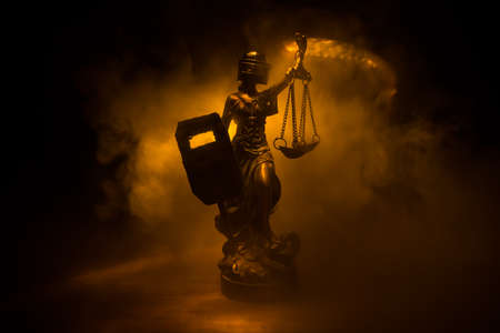 The Statue of Justice - lady justice or Iustitia / Justitia the Roman goddess of Justice on a dark fire background. Selective focus