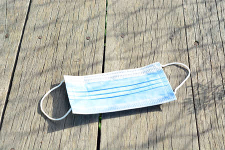 Medical face mask on floor street pavement. Virus protection healthcare item equipment. used. Dirty.