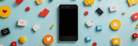 A flat lay photo featuring colorful social media icons like hearts, play buttons, and messages surrounding a smartphone on a blue background.