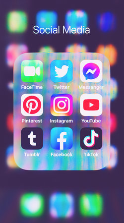 Los Angeles, California, USA - 25 January 2020: A pile of different social media icons and logotypes like YouTube, Twitter and Instagram top view, Illustrative Editorial.