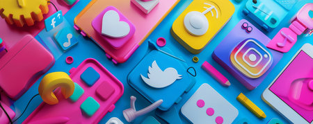 Bright and colorful social media icons scattered on a vibrant desktop. This playful arrangement creates an inviting atmosphere for creativity and online interaction.