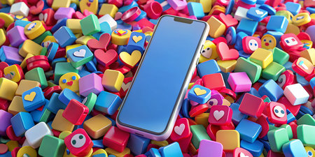 A smartphone is positioned on a bright blue surface, surrounded by vibrant notification icons representing likes, comments, and shares.