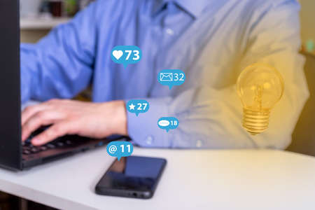 Person using a social media marketing concept on computer laptop with notification icons of like, chat, message and comment above laptop screen.
