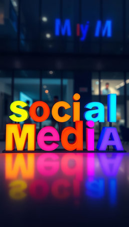 Colorful neon sign of social media with reflection in office building at night