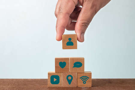 Hand of male putting wood cube block with social media on wooden table. Social media concept