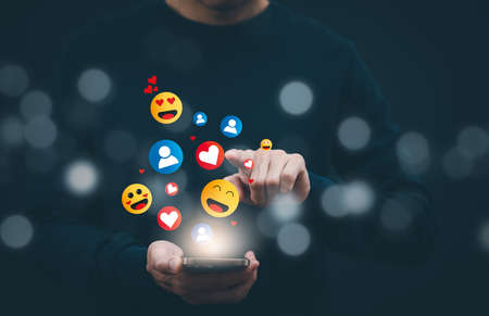 Concept with notification icons of like above smartphone screen,Social media interactions on mobile phone, a man's right hand holding device, internet digital marketing.