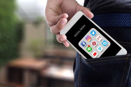 BANGKOK , THAILAND - January 27th, 2017: Hand of man using Iphone with social on screen social media concept