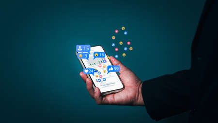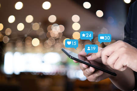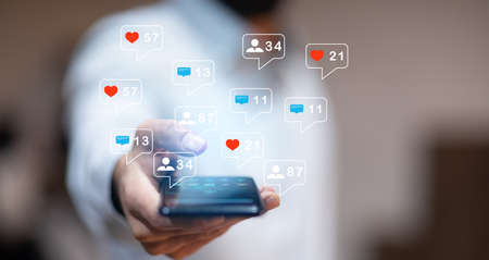 Concept with notification icons of like above smartphone screen,Social media interactions on mobile phone, a man's right hand holding device, internet digital marketing.